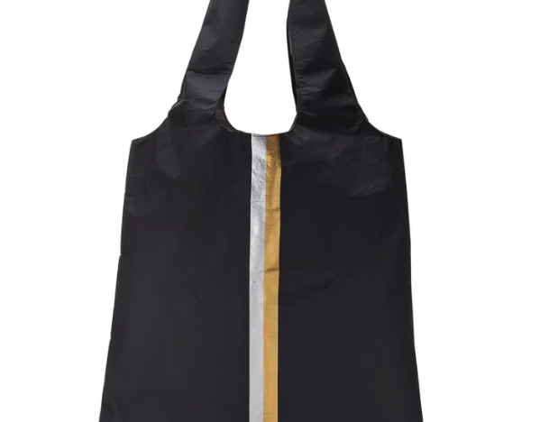 Carryall Tote Bag with Pocket in Black with Silver & Gold Stripes
