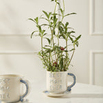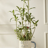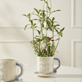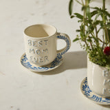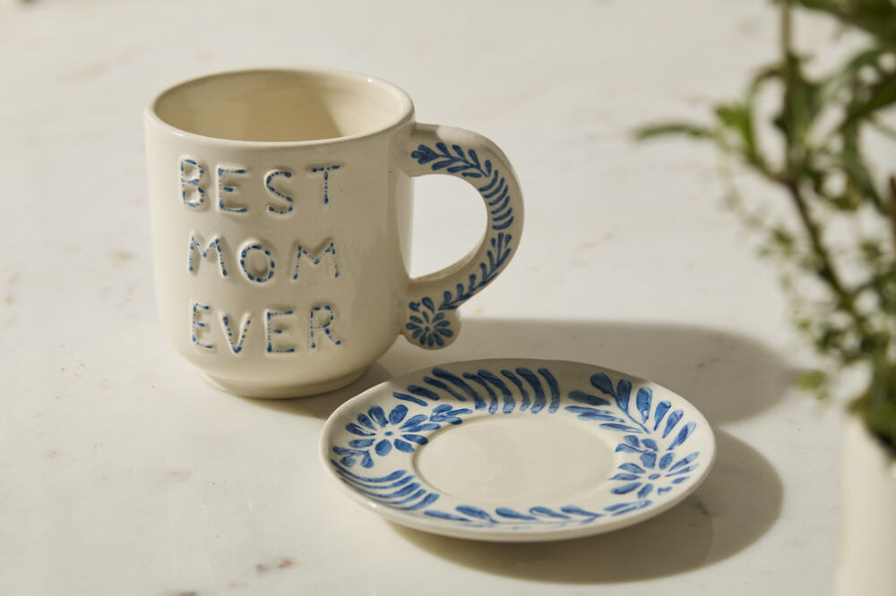 Give Mom an affirmation she can see every day with the Best in Blue Mug. This mug & saucer features hand cut & applied lettering on the front that says "Best Mom Ever" with blue & white detailing on a white ground color. The mug handle & saucer are hand painted with a matching blue leaf pattern. Perfect for morning coffee or even a 3-inch drop-in plant, this mug makes a lovely Mother's Day or birthday gift.