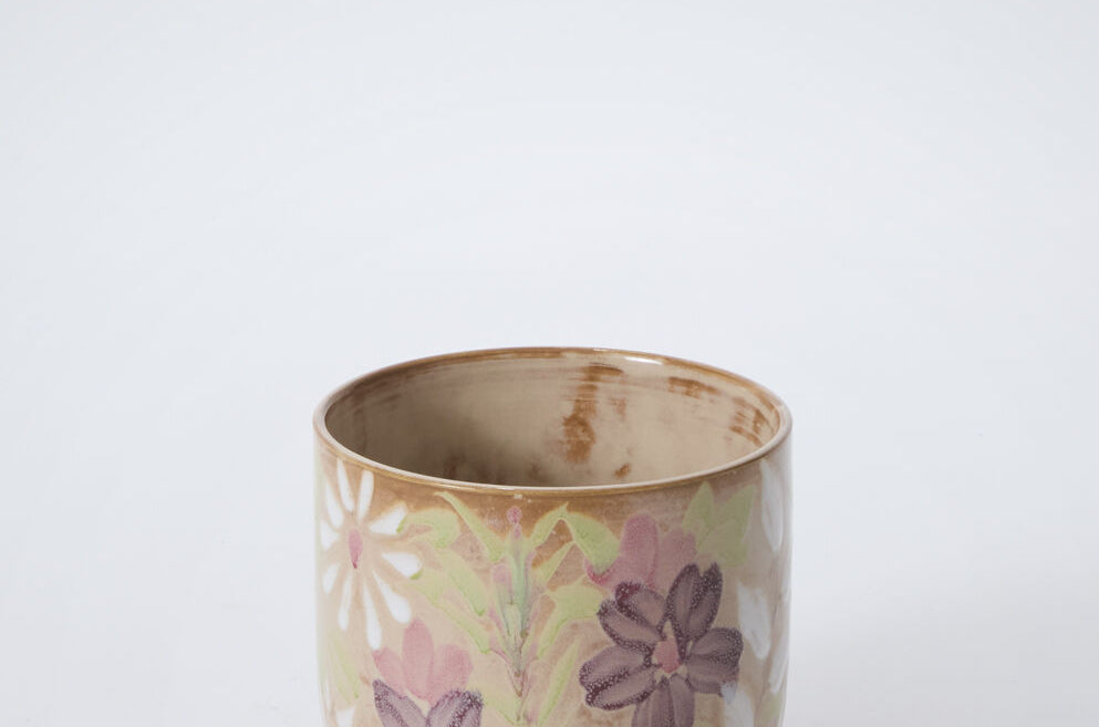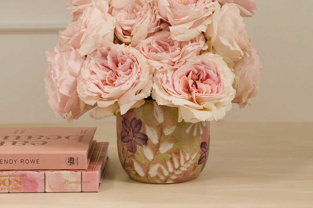 The best colors of spring are on display with the hand painted cylinder ceramic Bloomlet Pot. Featuring watercolor, washy blooms in white and pink with green stems, this artful vessel brings organic pattern and texture to decor. It makes a lovely vase for a mono-floral or tonal palette arrangement and fits a 4.5-inch drop-in plant for a sweet gift.
