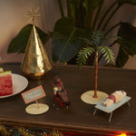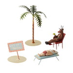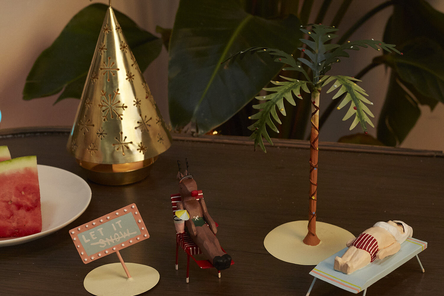 Santa and his reindeer get some R&R in the Christmas Getaway Scene. This grouping of painted metal figurines includes a sunbathing Santa on lawn chair, Rudolph with a tropical drink, a palm tree, and a sign that dashes out hopes of snow.