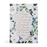 This beautiful large print ESV Single Column Journaling Bible® is named Victoria, inspired by the natural eucalyptus and blooms of Victoria, Australia. We are so excited to offer this beautiful floral Bible for those who prefer larger-printed text with a refreshed design! We chose 1 Corinthians 13:7 to be scripted on the back cover: “Love bears all things, believes all things, hopes all things, and endures all things.” This verse reminds us of the breadth and depth of the love of God—that when truly laid over our lives, we can discover the richness of our faith in him.