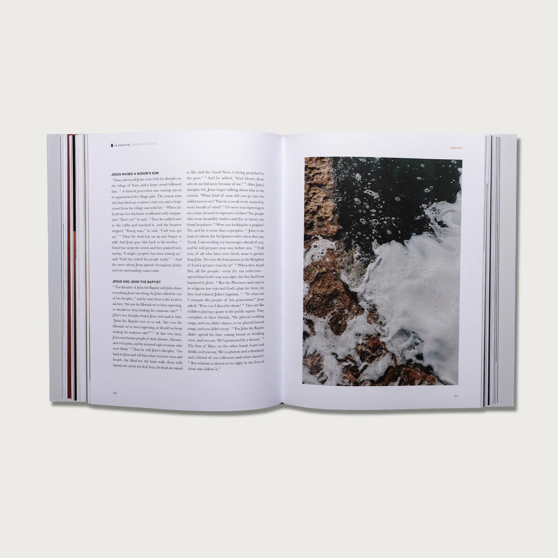 This book is hardcover with visual imagery and thoughtful design incorporated into the full unedited text from the Bible. Alabaster’s approach reimagines the entire experience of the book. Incorporating images that illuminate the themes and messages of the text, this book will help the reader engage scripture in a fresh way. The Gospels in the New Living Translation (NLT) is great for Bible studies, church groups, or individual devotional times.