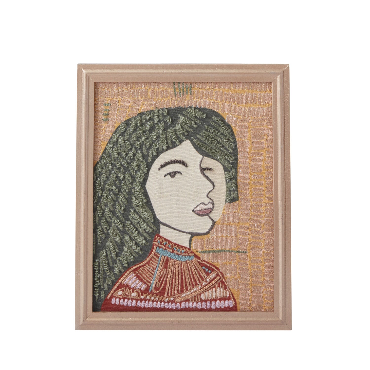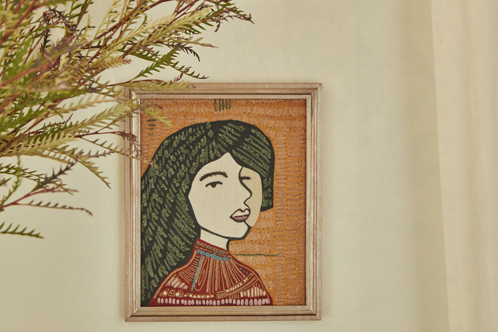 Add texture & feminine beauty to your walls with the framed Laelia Wall Art, featuring an intricate embroidered portrait on cotton, inspired by Latin American artwork & colors. This large wood-framed textile is lovely layered into a gallery wall.