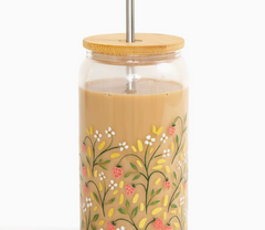 Features | Hand-painted design on glass coffee cup with bamboo lid. Straw included.
