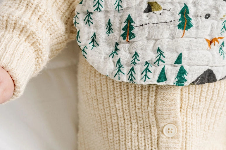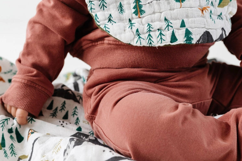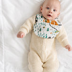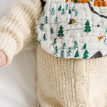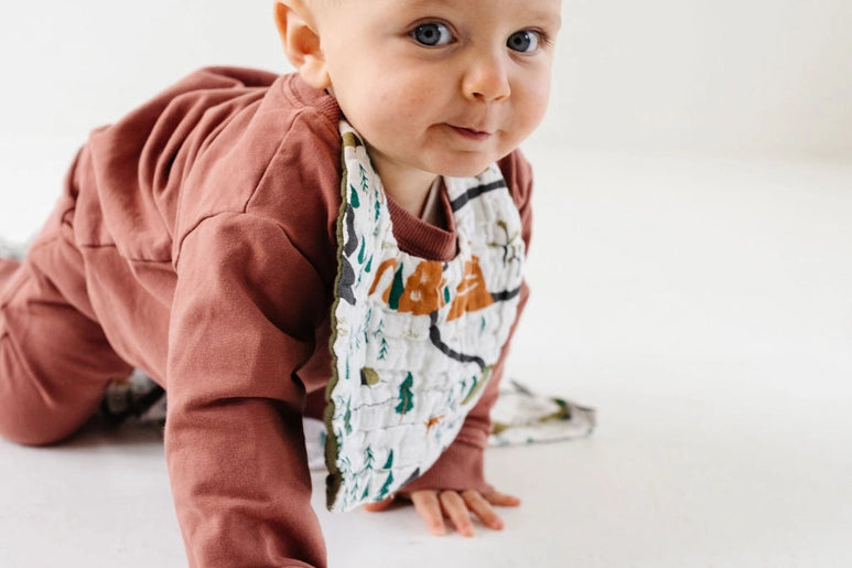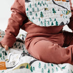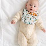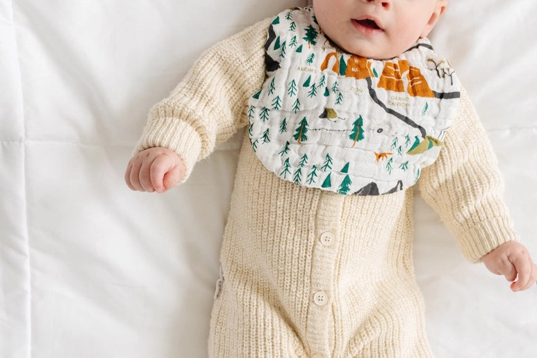 Meet our reversible National Parks Bib! One side is a connected pattern of some of our favorite National Parks, on the other, a deep forest green. Two options, both absorbent and adorable. Perfect for first foods, teething, and spit up, whatever you and your cutie need. * Double layered absorbant muslin * 8" wide, 9" tall and secure with 8" braided ties.