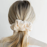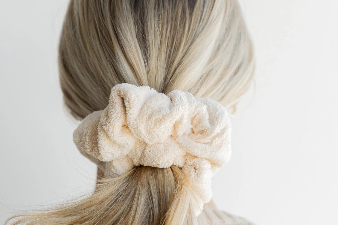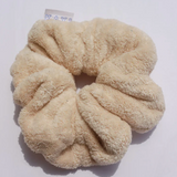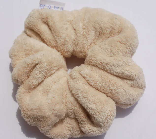 This brand new oversized scrunchie is designed to soak up water in your hair whether that is at the beach, the lake, after a shower, or while you're working out. The absorption of water helps your hair dry faster naturally, and is especially good when separating your hair while blow drying (limiting the amount of heat on your hair). The soft plush towel-like microfiber material helps limit creasing in your hair while wearing.