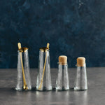 This set of two petite, cork-topped carafes combines delicate craftsmanship with versatile functionality. Perfectly sized for use as oil and vinegar cruets on the dining table, they bring understated elegance and texture to everyday meals. Beyond the kitchen, these charming vessels also serve beautifully as containers for your favorite bath oils or potions, offering a thoughtful touch of refinement wherever they’re placed. The gently pebbled glass surface enhances grip and visual appeal, making these carafes as practical as they are graceful. Capacity: 2.25 oz.