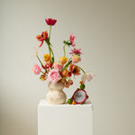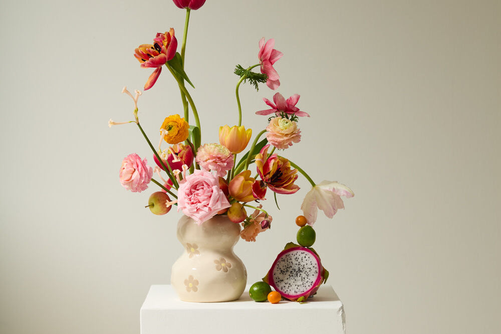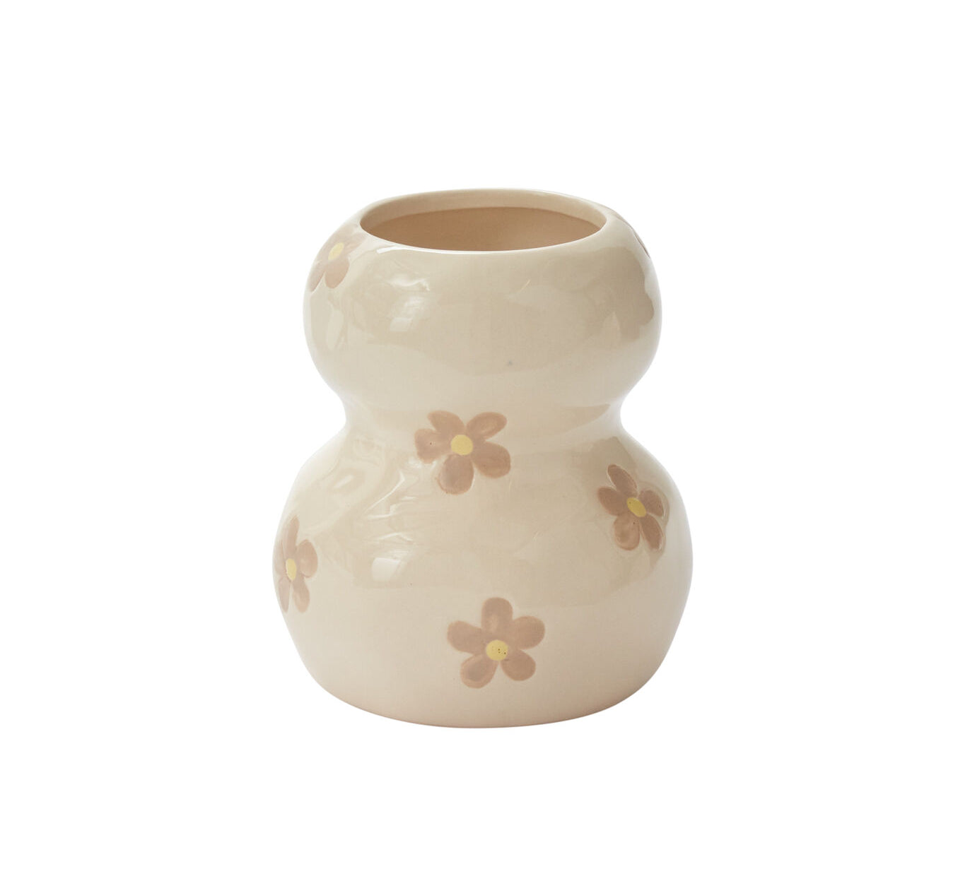 Add a fresh, feminine look to everyday or event displays with the ceramic Petunia Budvase. Featuring a curvy silhouette, glossy finish, & natural bisque flowers peeking through the creamy glaze, this hand painted warm neutral vessel makes a playful statement for any floral color palette. The lid lifts off for easy arranging, water filling, & cleaning.