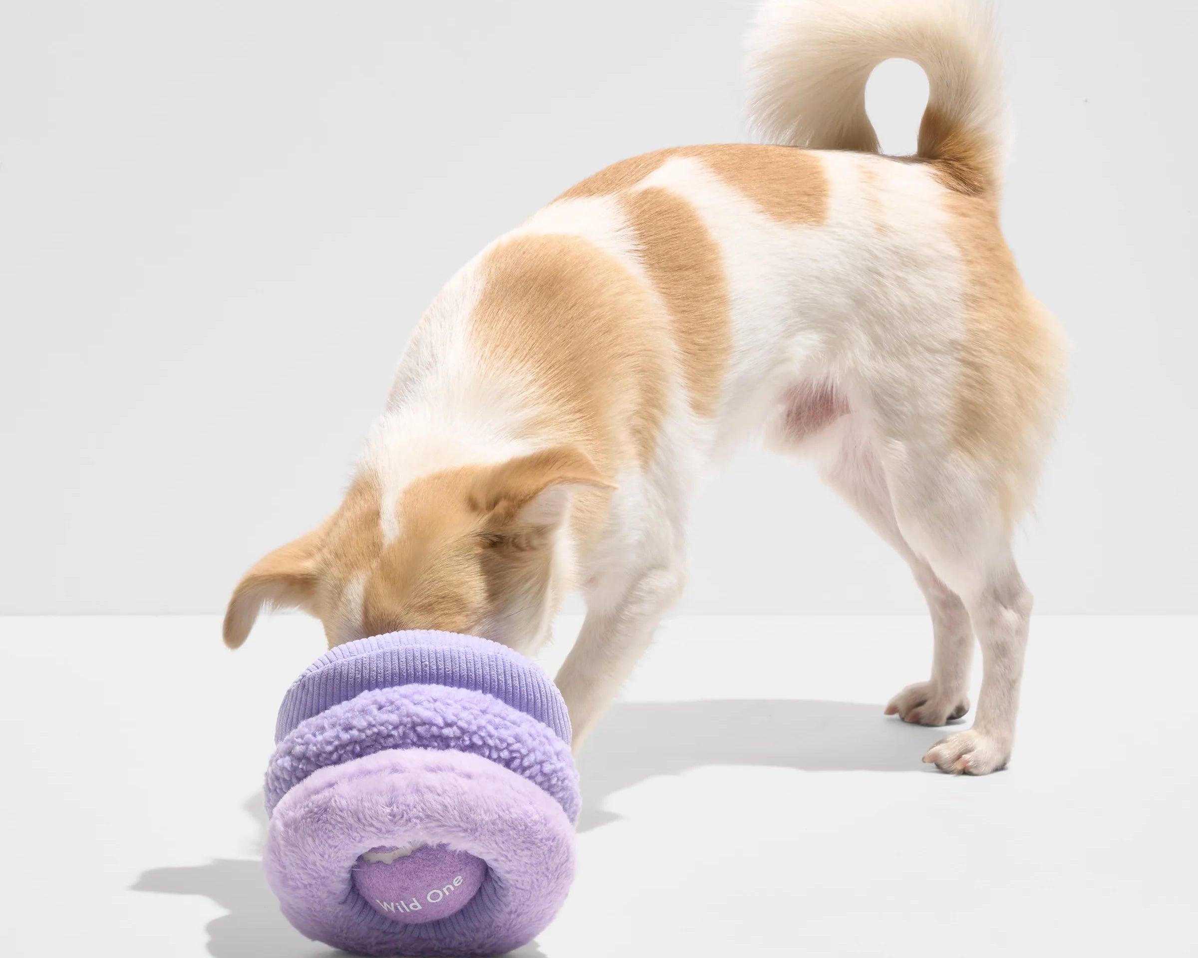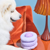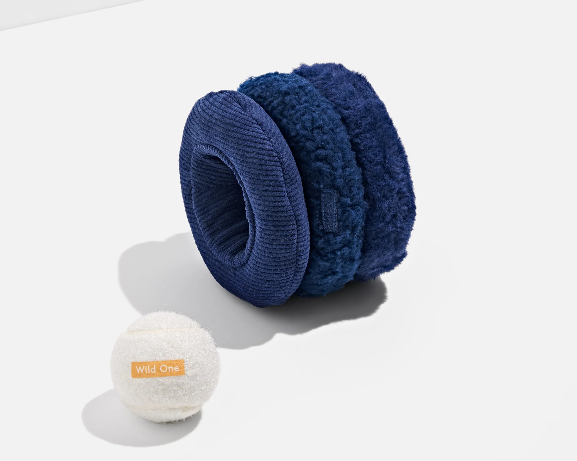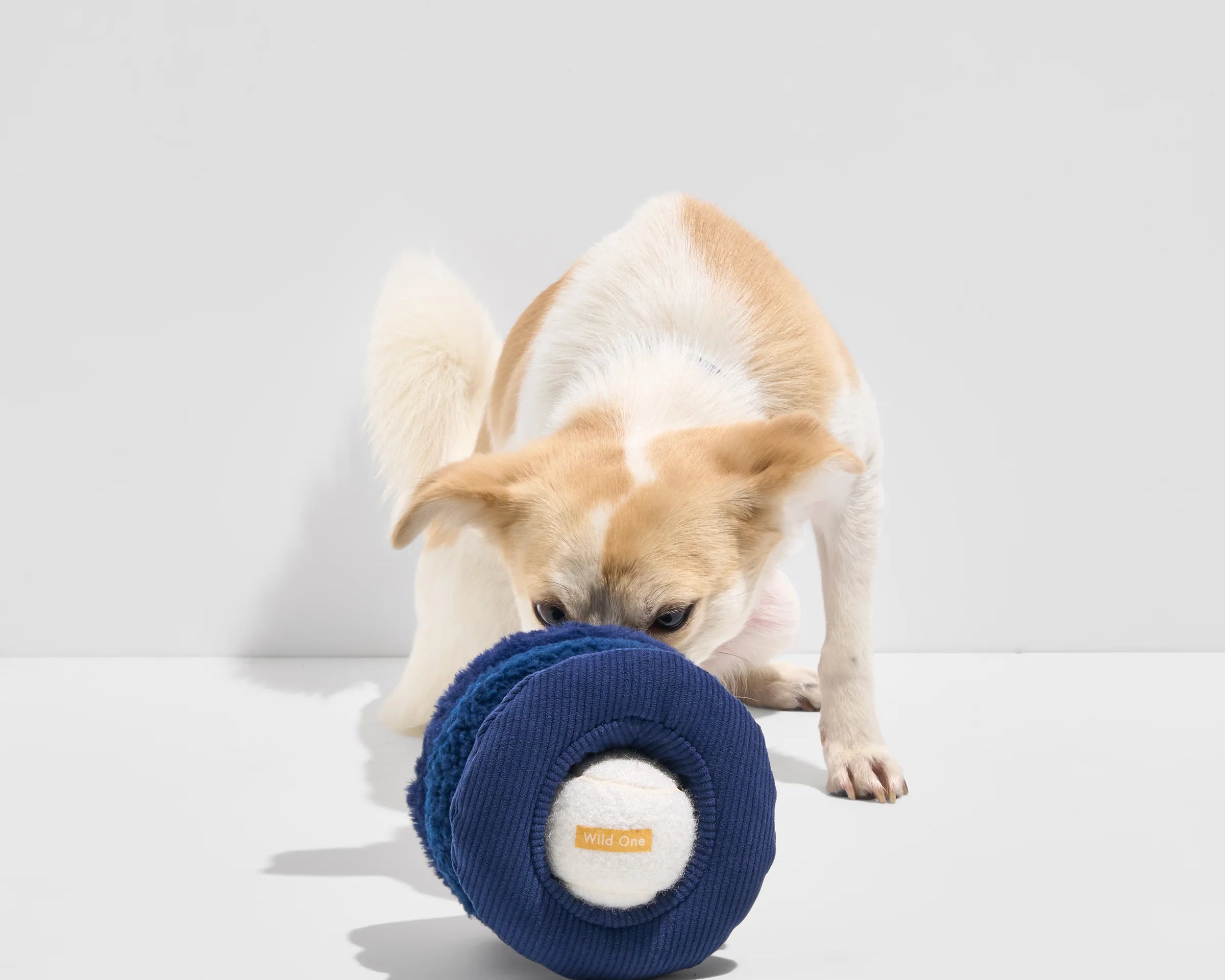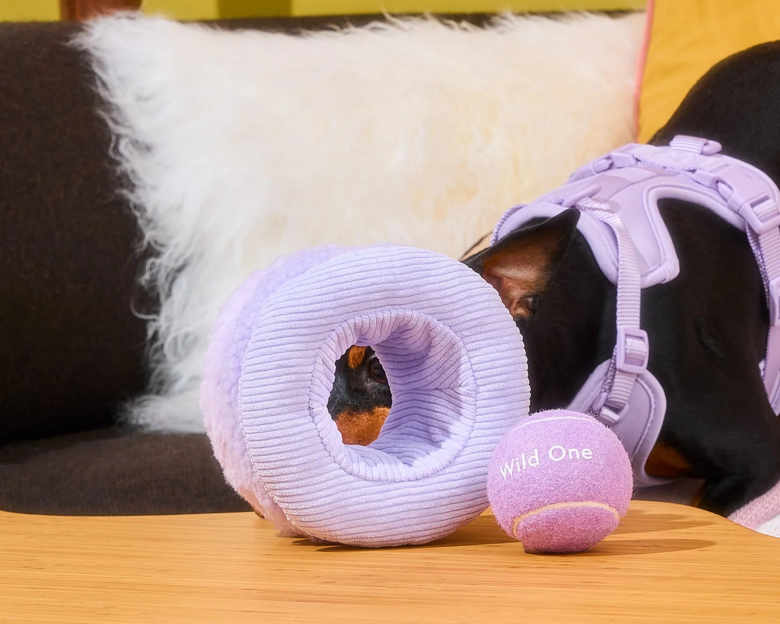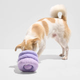 A puzzle toy packed with sounds, textures, and reward keep your pup busy and captivated. Features a hidden tennis ball inside a tri-stack of sherpa, corduroy, and fluff textures, with crinkle, high and low squeak sounds.