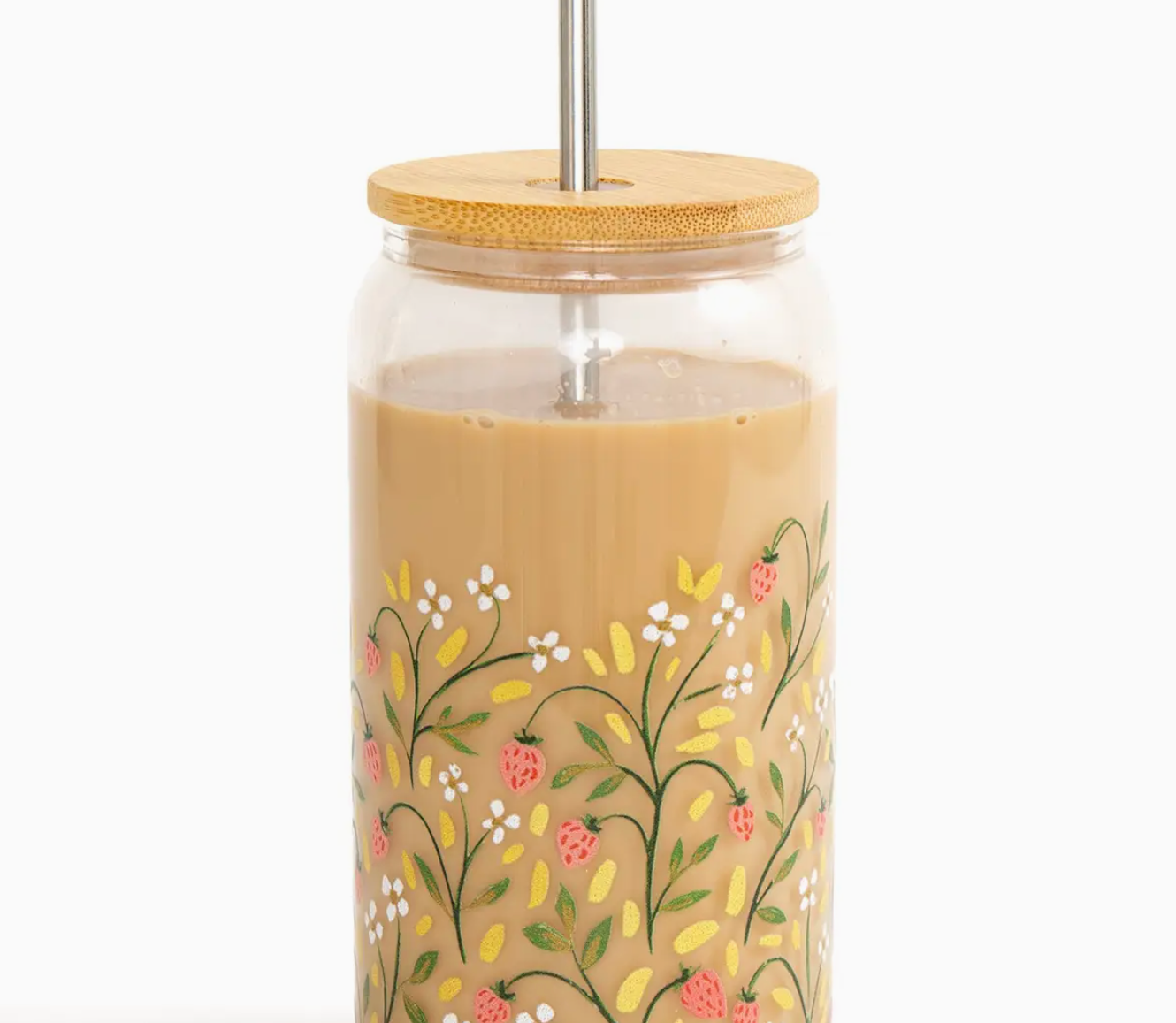 Sip your way through summertime with the Strawberry Meadows Glass Can! This adorable can is perfect for drinking on-the-go, featuring a reusable straw for convenience. Take a sip of nostalgia with every sip of your favorite beverage.