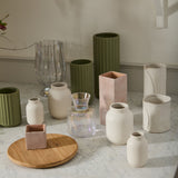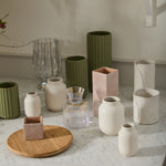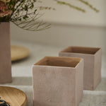 With a dusty pink hue, brushed white finish, slight grit texture, & medium cube shape, the ceramic Vincent Pot offers a unique neutral base for a 4.5-inch drop-in plant or or any color palette of fresh or dried florals